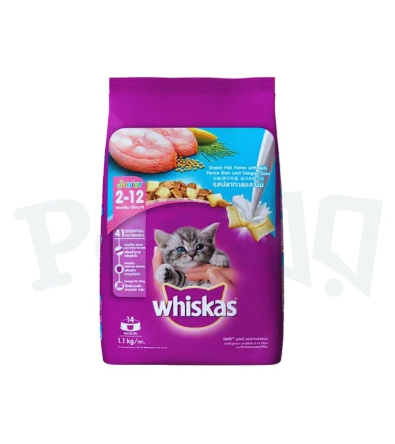 Healthy growth starts with Whiskas — try Whiskas Junior Ocean Fish & Milk 1.1kg, now at Petghor! 🐾